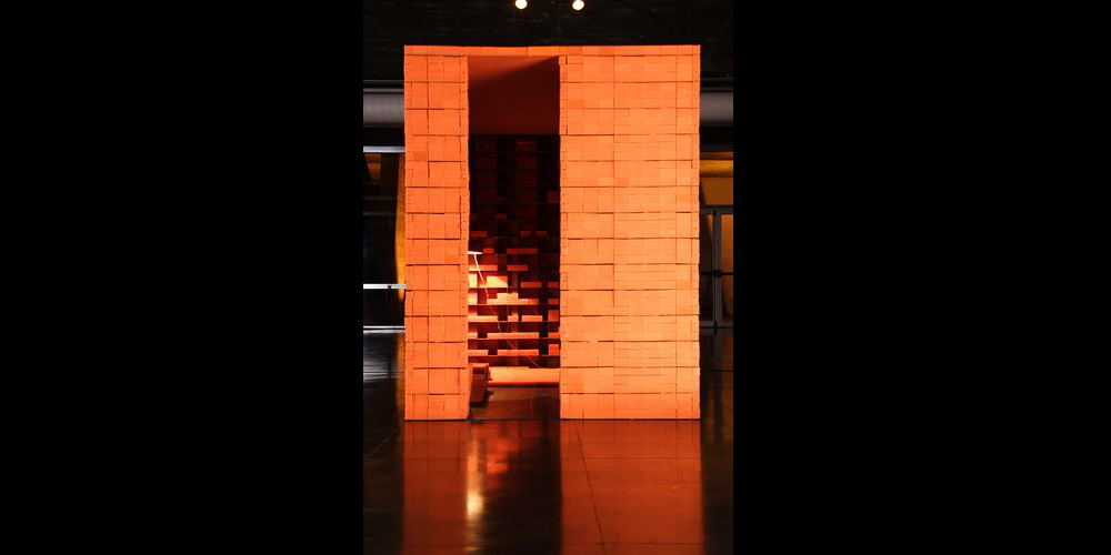 Installation Opposer les contraires en toute clarté, 300x200x250cm, acier, néons, savons, valise, photo: Wilson Montenegro