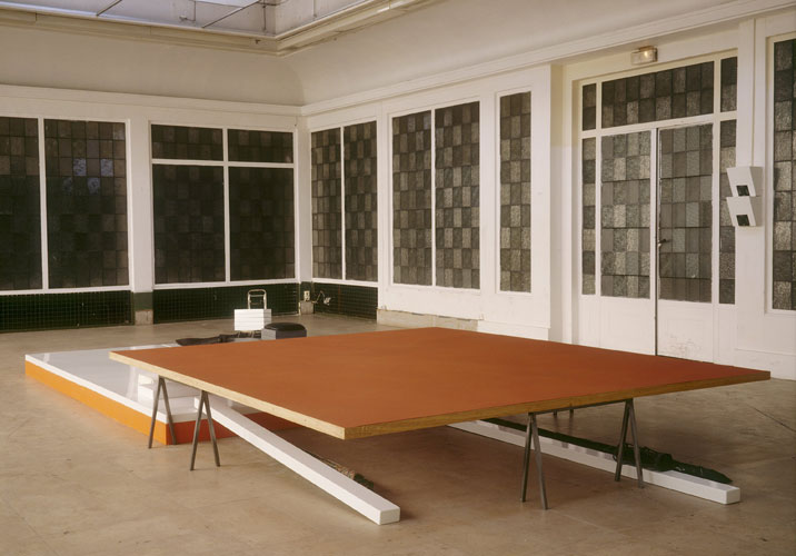 Caler, Décaler, 250x500x70 cm, bois, acier émaillé, toile tergal plein jour, divers éléments.Laura Lamiel, Cécile Bart