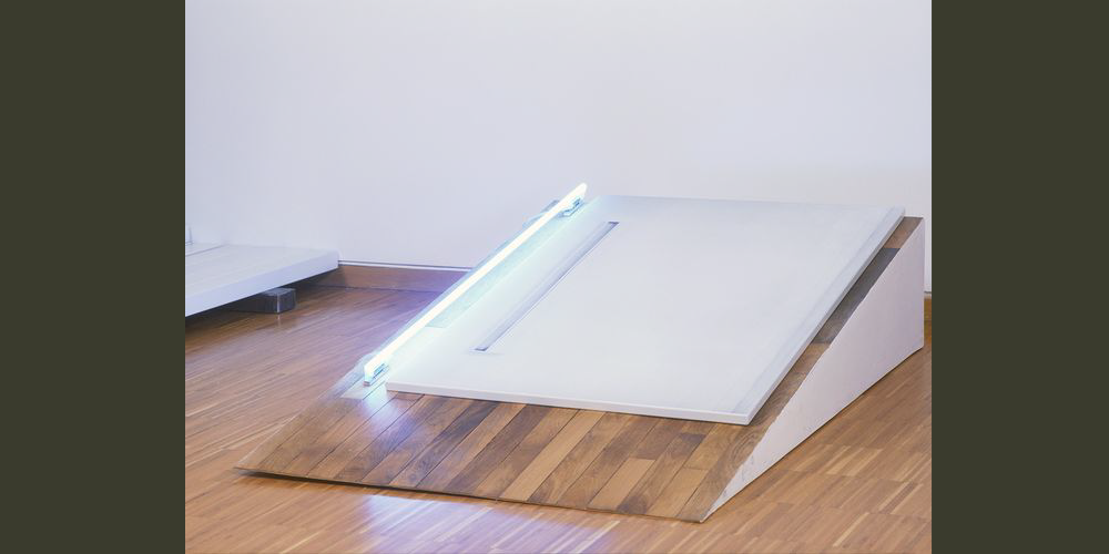 Installation 2000 (détail), acier émaillé sérigraphié, néon, boisphoto: Marc Domage