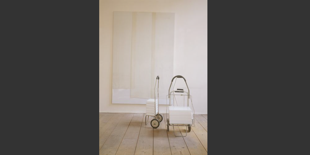 Vue de l'exposition, acier émaillé blanc, diables, photo: Marc Domage.
